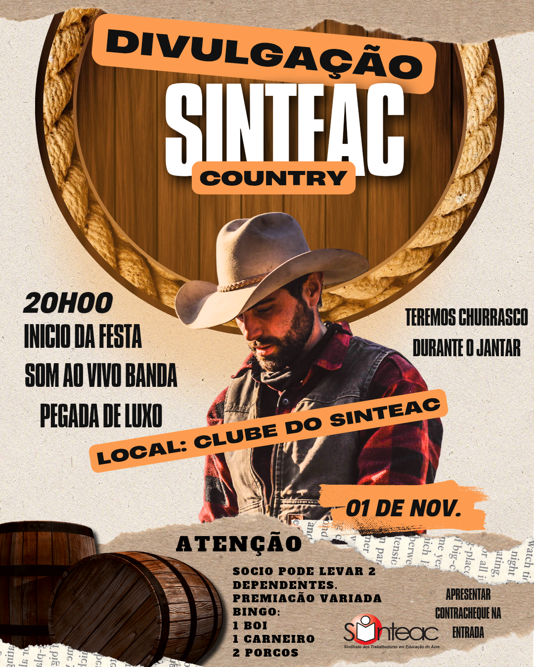 Em clima de alegria e valorização, o Sindicato dos Trabalhadores em Educação do Acre (SINTEAC) realiza neste sábado, 1º de novembro, uma grande festa em homenagem aos servidores da educação. O evento, que promete ser uma noite de muita diversão e confraternização, terá como tema o estilo country, reunindo filiados e seus dependentes no Clube do SINTEAC, a partir das 8 horas da noite.